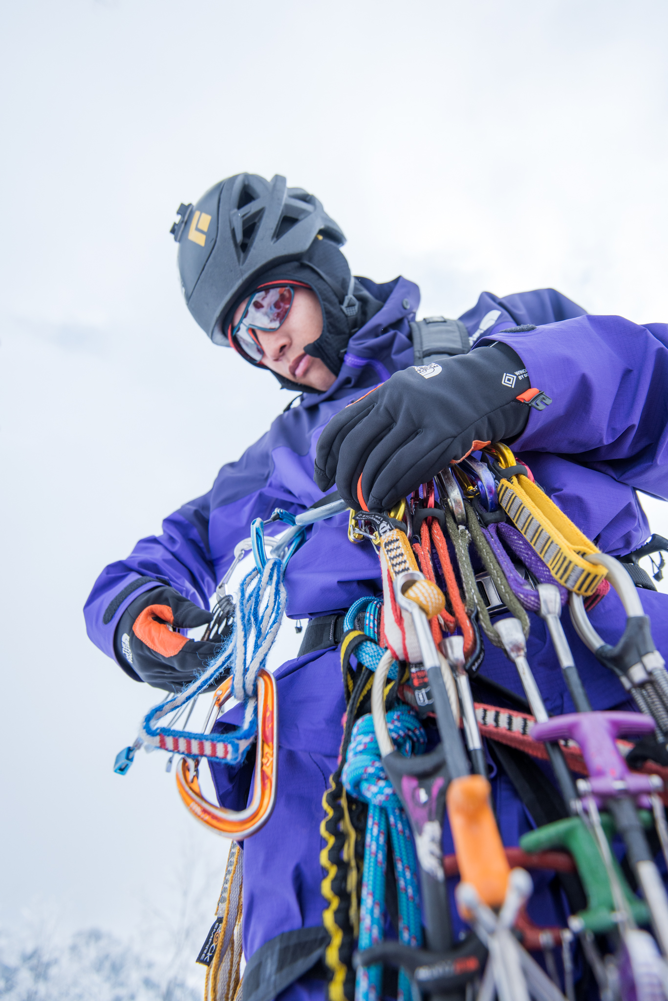 最初に試着した瞬間から、吸い付くような装着感に惹かれました。ビレイはもちろん、ロープの操作性もこの手のグローブの中でもトップクラスで、アックスを使ったミックスクライミング、特にドライ要素が8割というような高難度のシングルピッチでも活躍します。