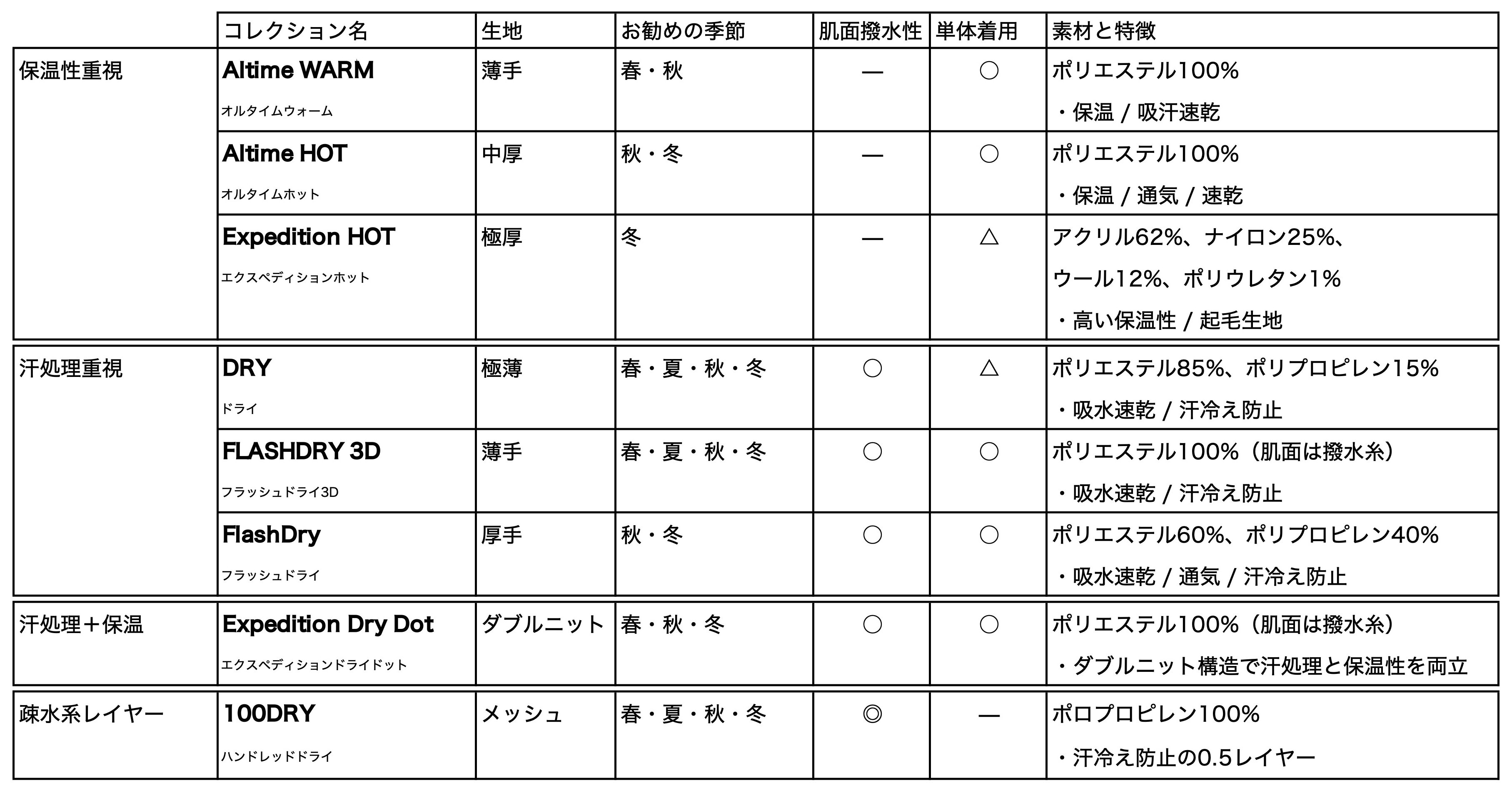 ——まとめると、まずは「100DRY」を基本にして、上には季節に応じた厚みのベースレイヤーを重ねる。あるいは、単体なら、寒いコンディションは「Expedition Dry Dot」で、温暖になれば「FlashDry」系に移行していく。