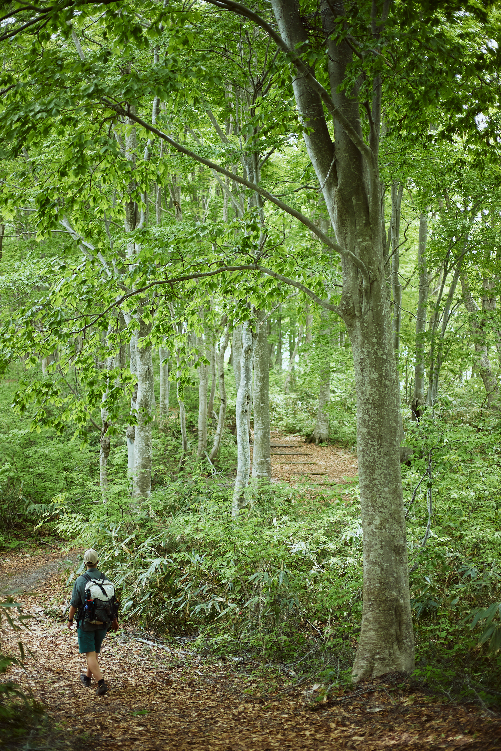 美しい新緑のブナの森を信越トレイルクラブの佐藤有希さんと歩く。ときおり「ST」という信越トレイルのロゴマークが記された道標が目に入る。季節はちょうど雪解け直後。いよいよ信越トレイルがシーズンインを迎えるタイミングだ。