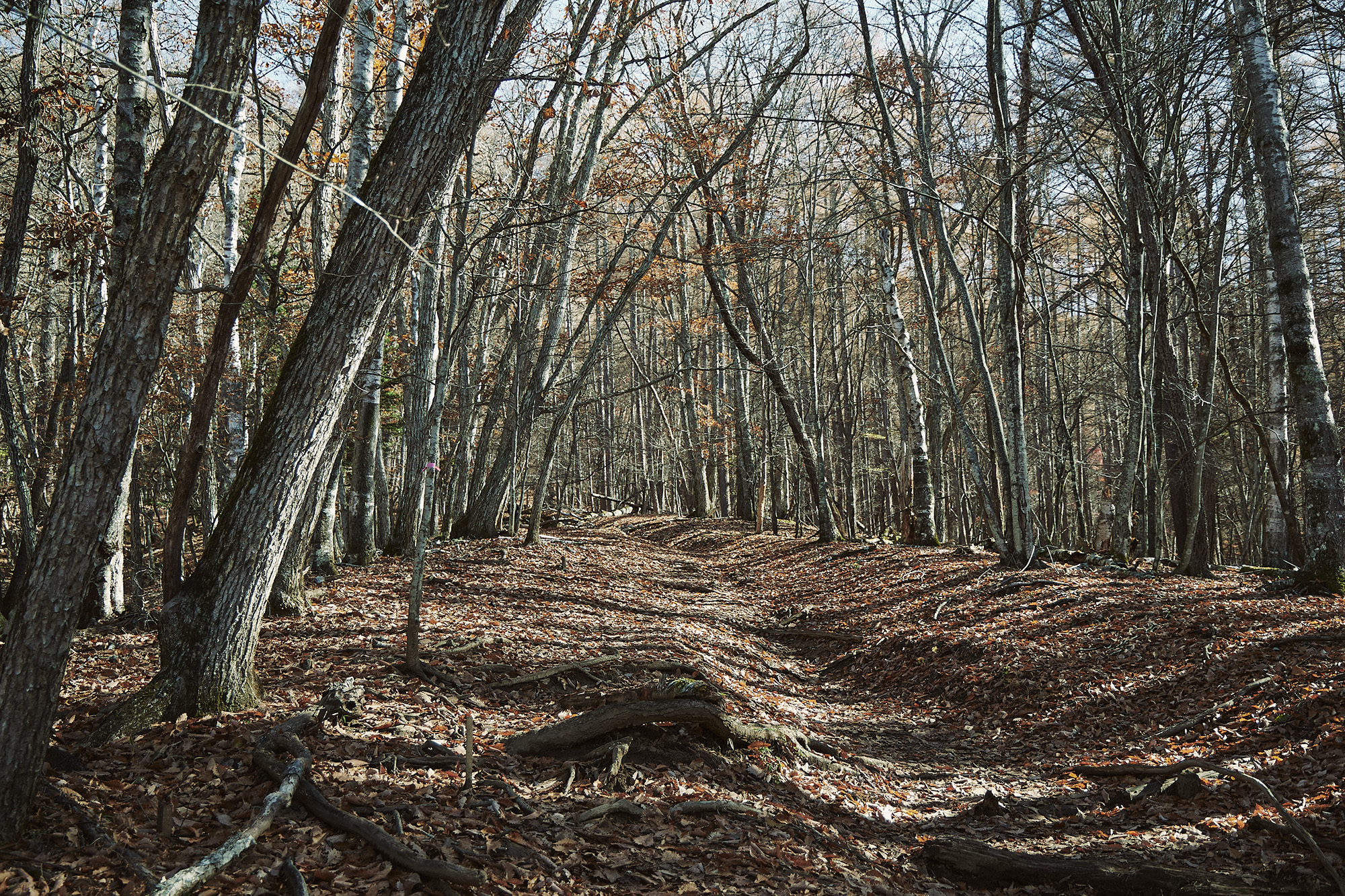 だが、じっくり見ていくと、登山道とそうでない場所が明確に違うことがわかってくる。登山道付近は、窪みになっていて、根が露出している部分が多い。そして植物がなく、かなり固い。その大きな原因としては、踏圧(人が踏むことによる圧力)と、雨による侵食だ。つまり人が歩くことによって水が流れやすい地形になってしまっているのだ。いっぽう登山道じゃない森の中は地面がふかふかしている。つまり保水しやすいから、植物が育つ土壌が残っているということだ。ただ、この山に関しては、登山道じゃない森の中にも、下草(下層植生)の姿はない。
