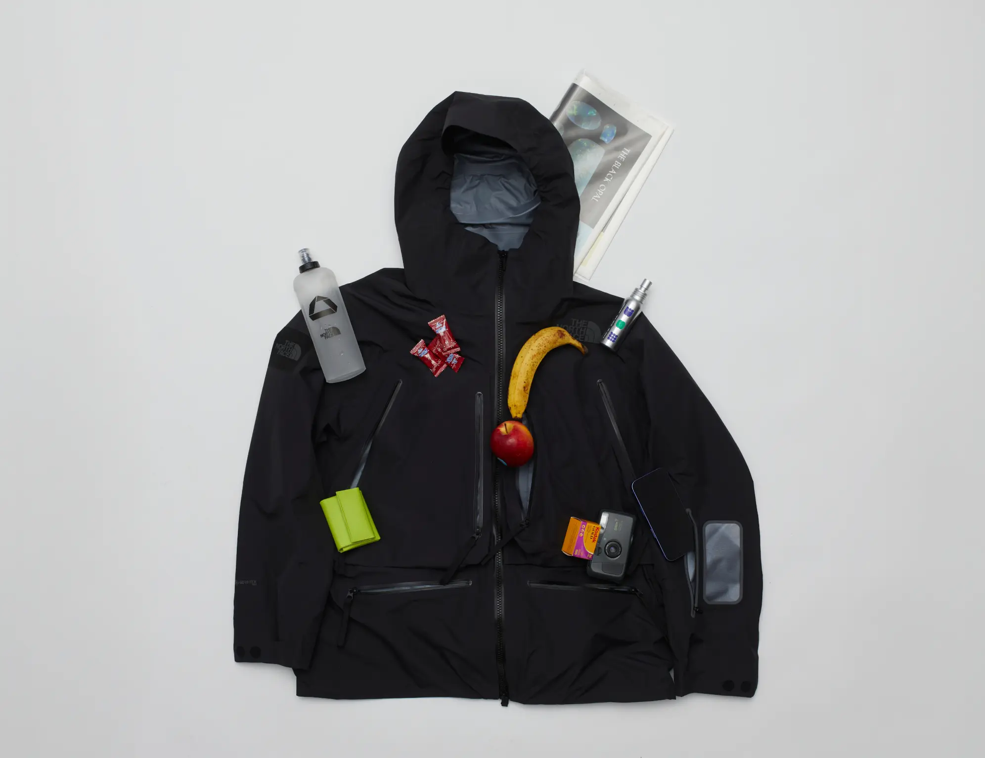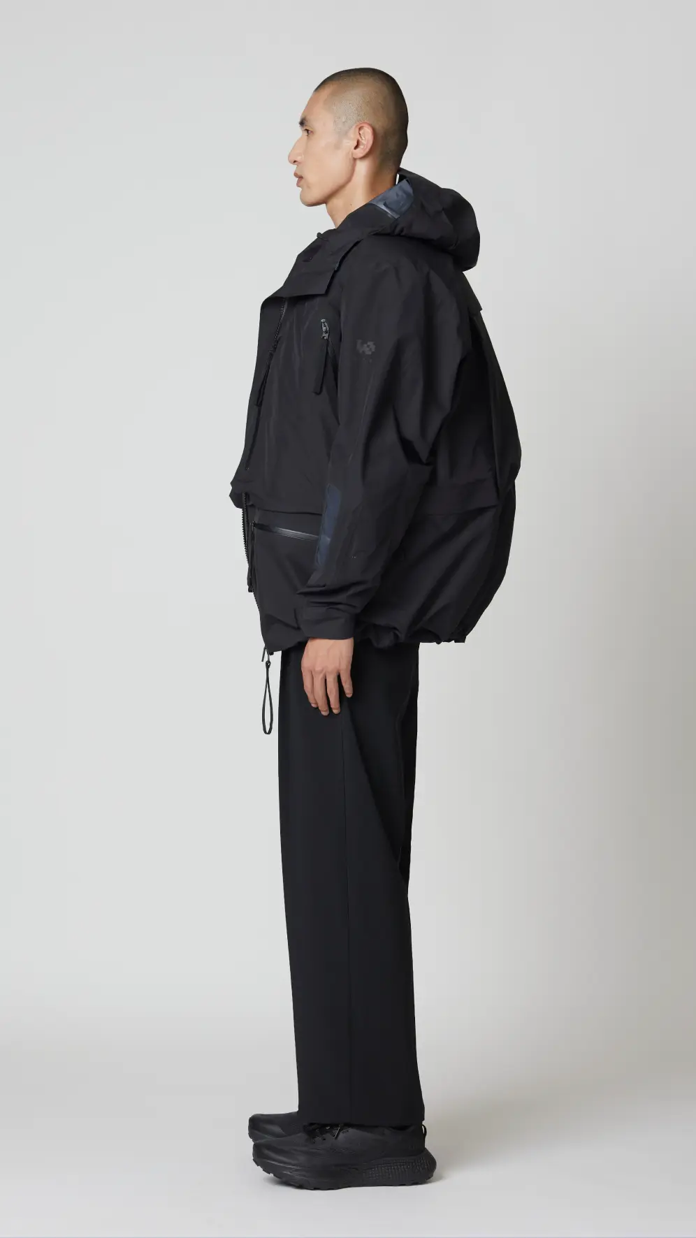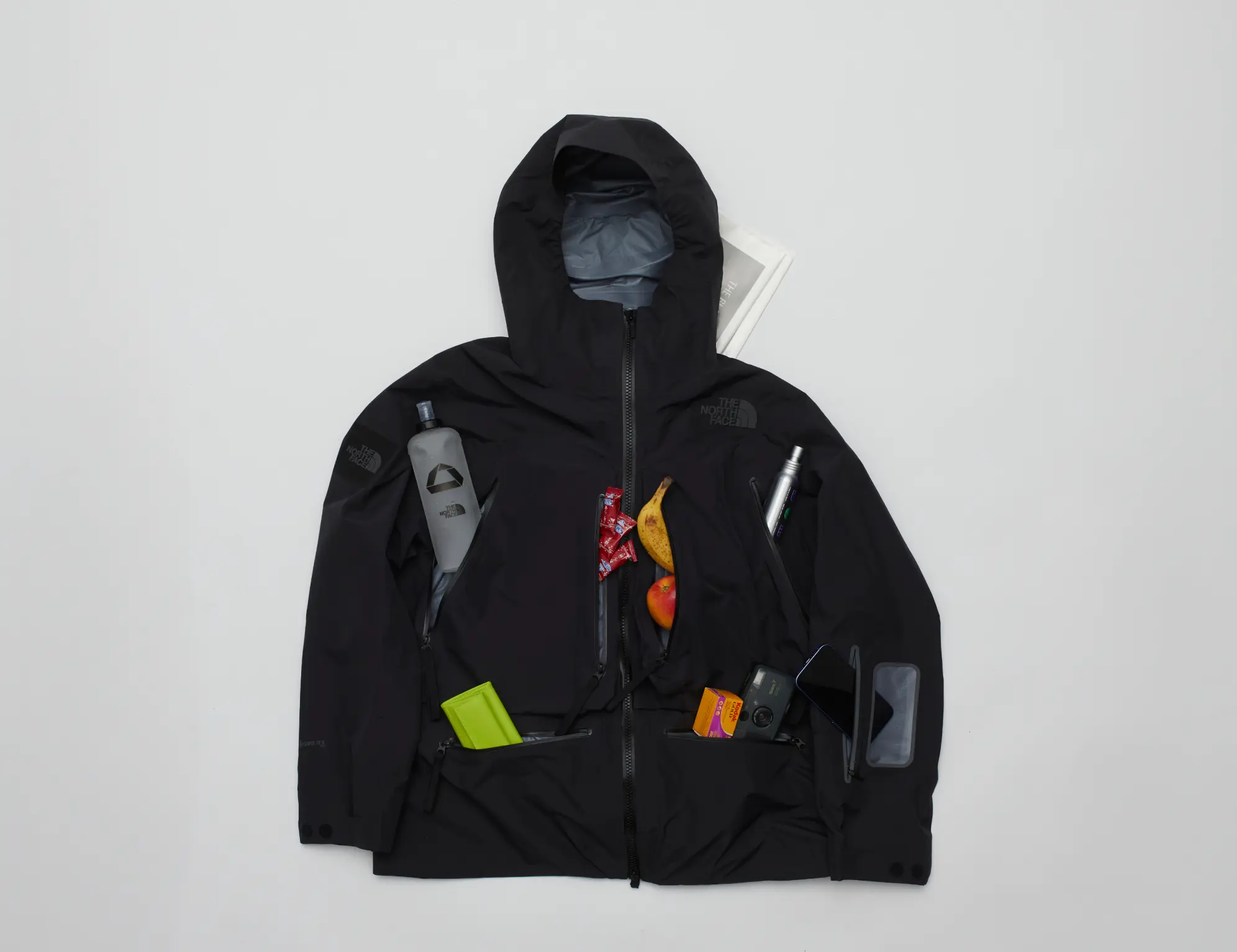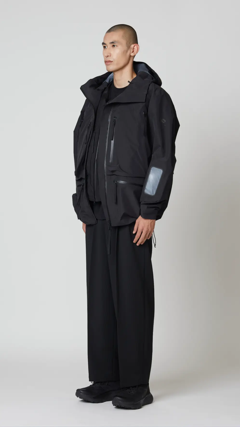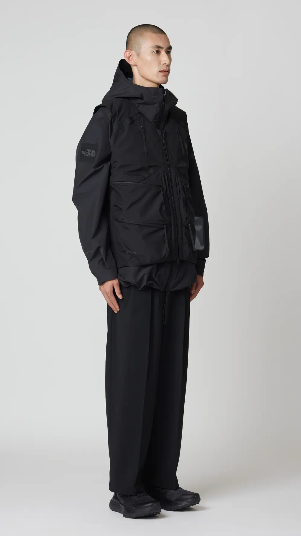 専用ポンプで保温性の強弱を調整可能で収納力にも長けたベストと、スマートフォンを収納可能な大型クリアウィンドウを含めた多数のポケットを備える防水ジャケット。その二つのプロダクトは単体での着用はもちろん、レイヤリングにおいても相互的に機能するようにデザイン・設計されている。ベストはジャケットの内側に着用すれば保温性を担保するミドラーとして、ジャケットの外側に着用する際は収納力を最大限に発揮するギアベストとして機能する。ジャケットも内側に着たベストに直接アクセス可能なポケットの配置や着方の幅に対応するシルエットなど綿密に設計された。
