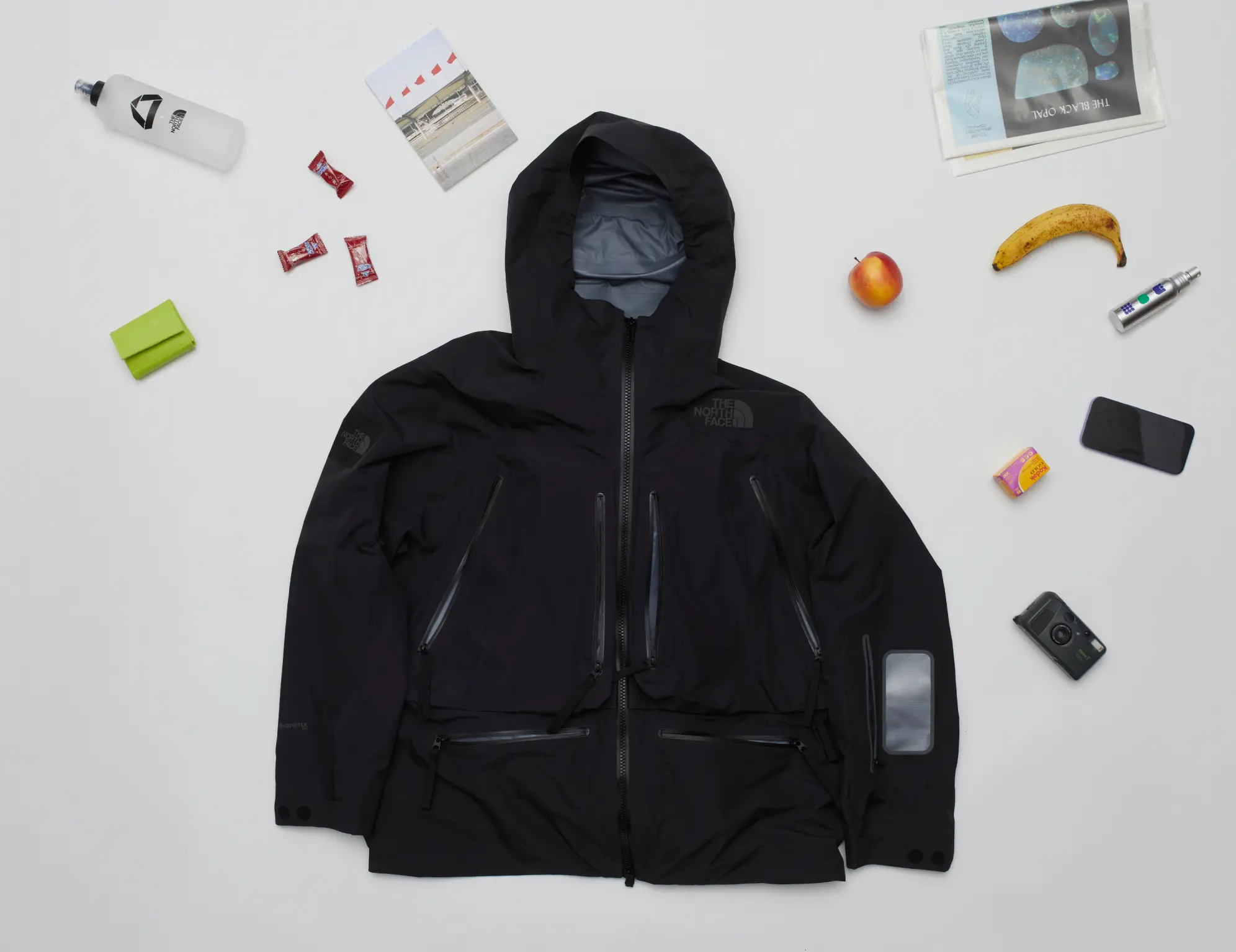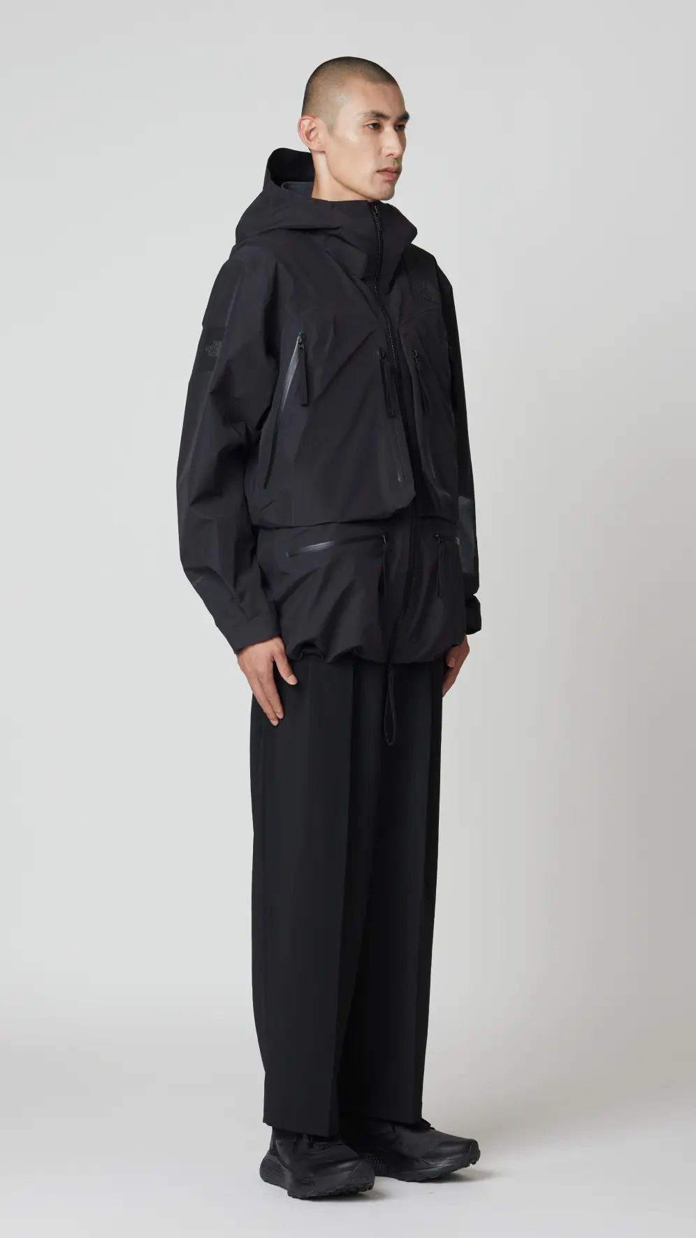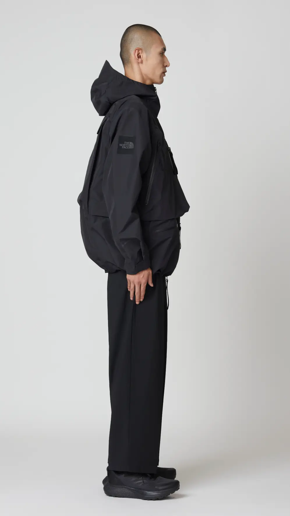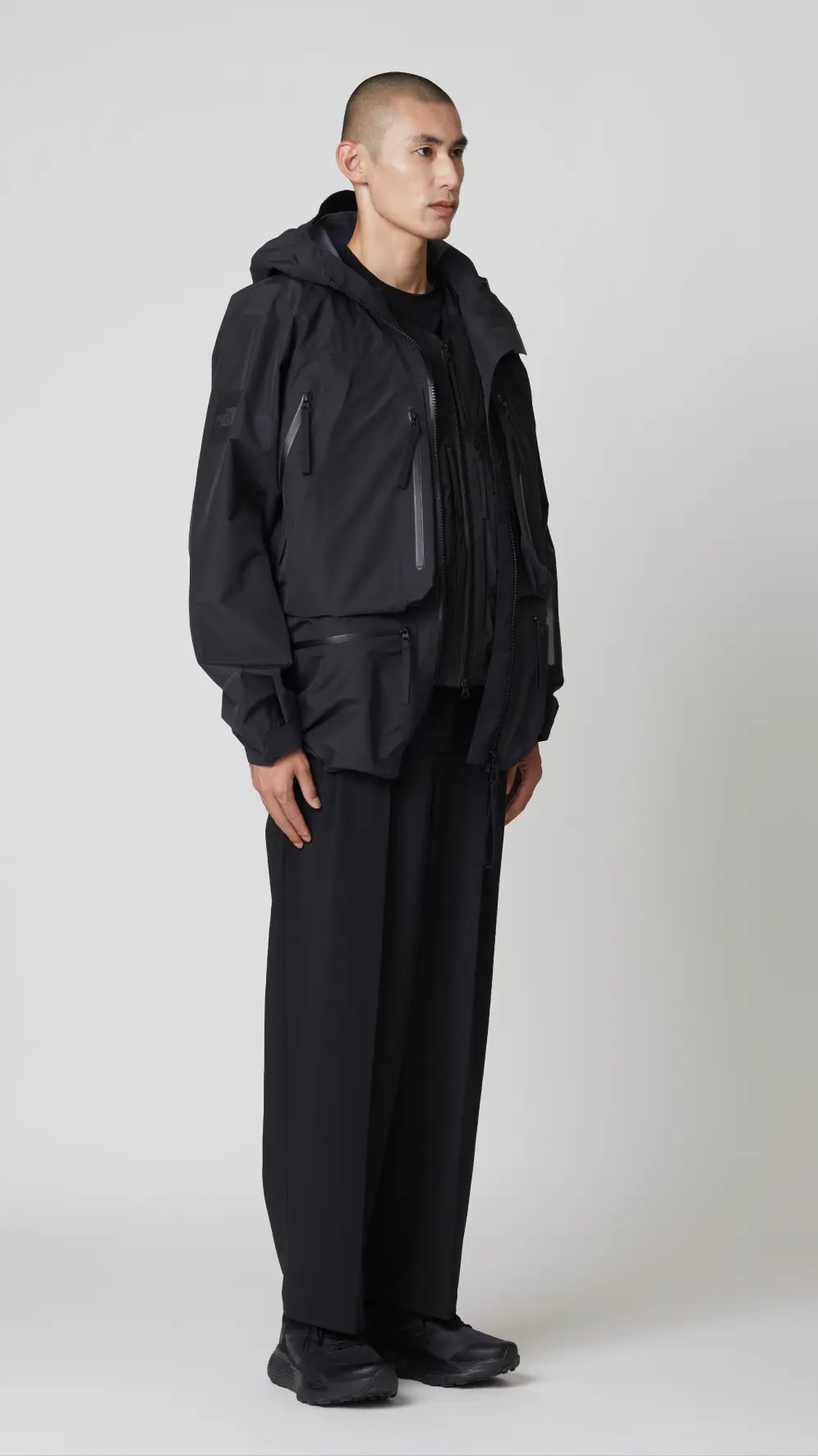 専用ポンプで保温性の強弱を調整可能で収納力にも長けたベストと、スマートフォンを収納可能な大型クリアウィンドウを含めた多数のポケットを備える防水ジャケット。その二つのプロダクトは単体での着用はもちろん、レイヤリングにおいても相互的に機能するようにデザイン・設計されている。ベストはジャケットの内側に着用すれば保温性を担保するミドラーとして、ジャケットの外側に着用する際は収納力を最大限に発揮するギアベストとして機能する。ジャケットも内側に着たベストに直接アクセス可能なポケットの配置や着方の幅に対応するシルエットなど綿密に設計された。