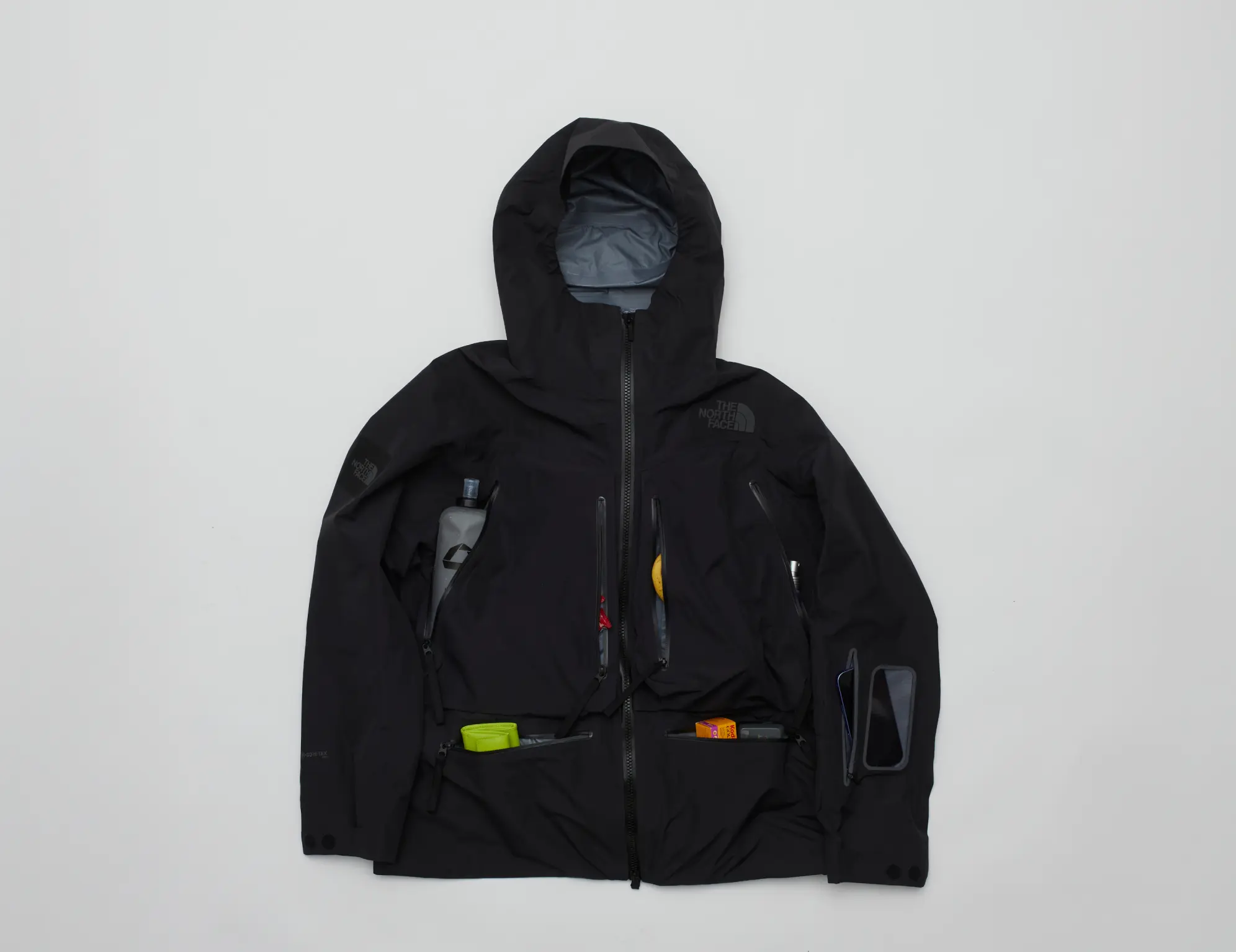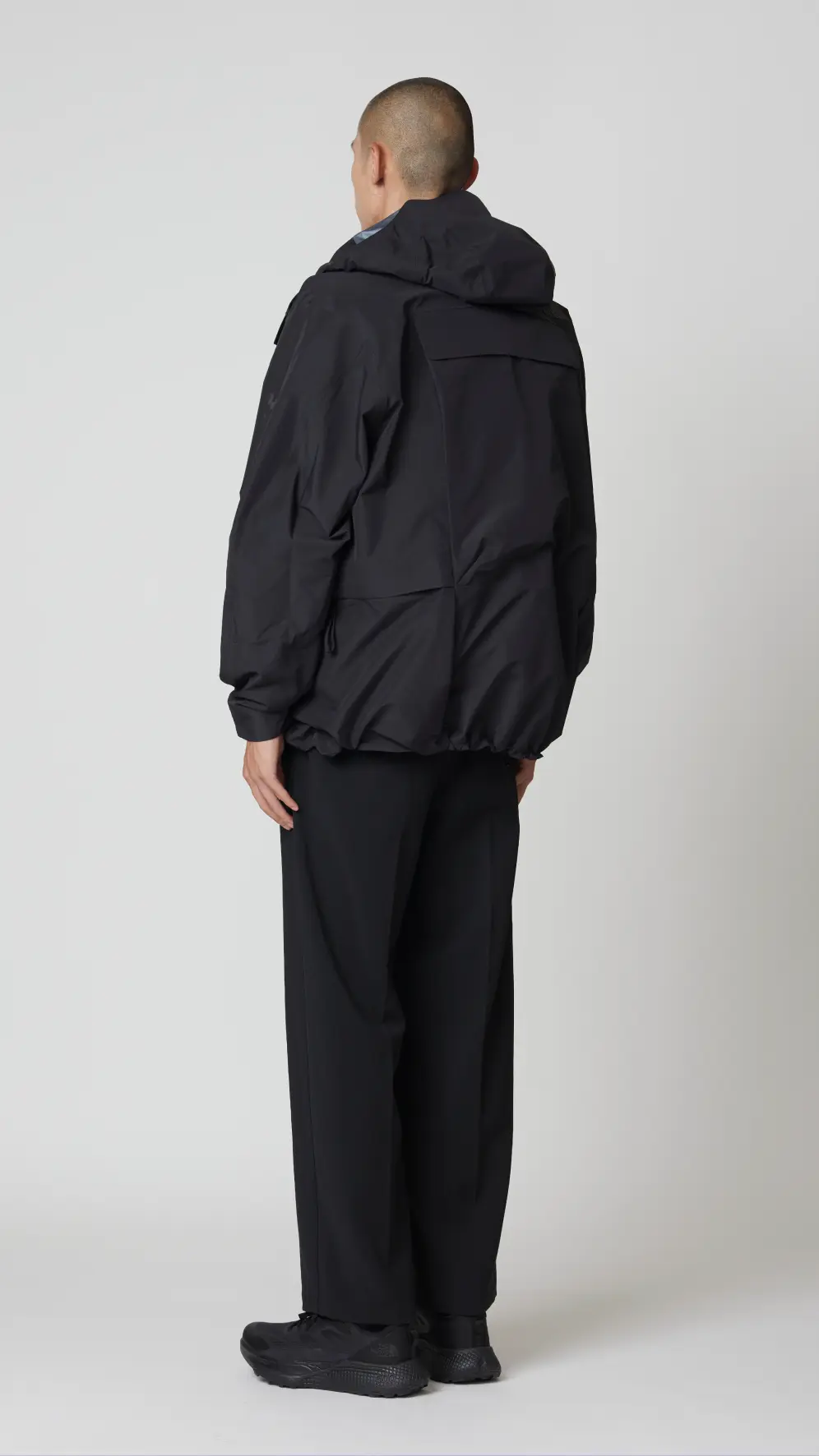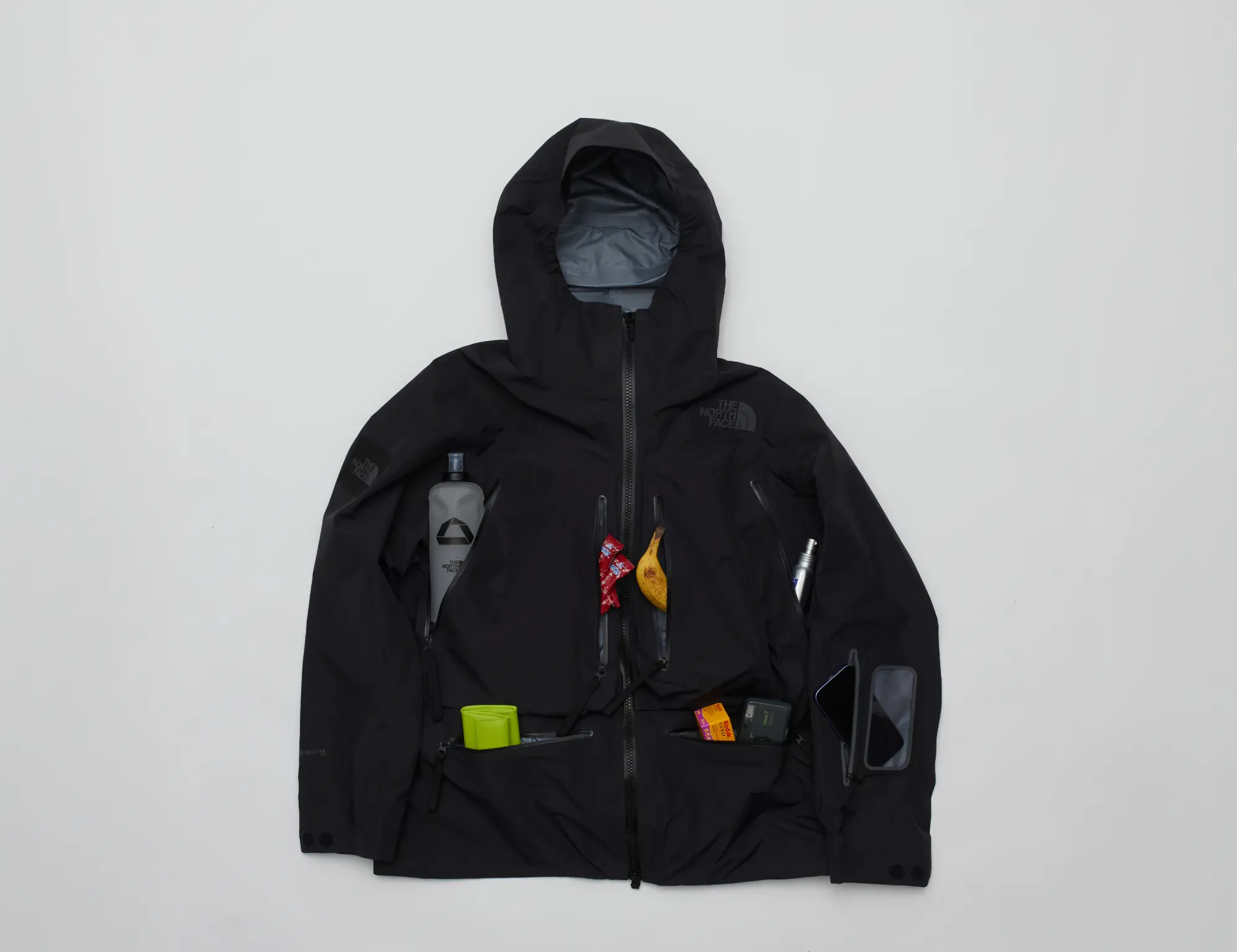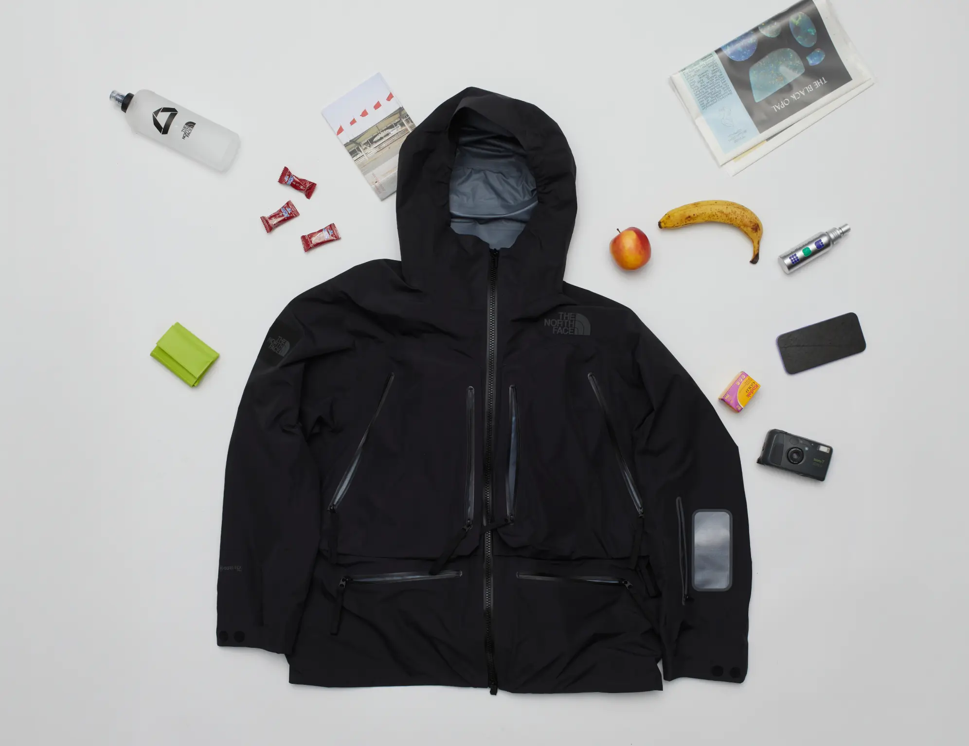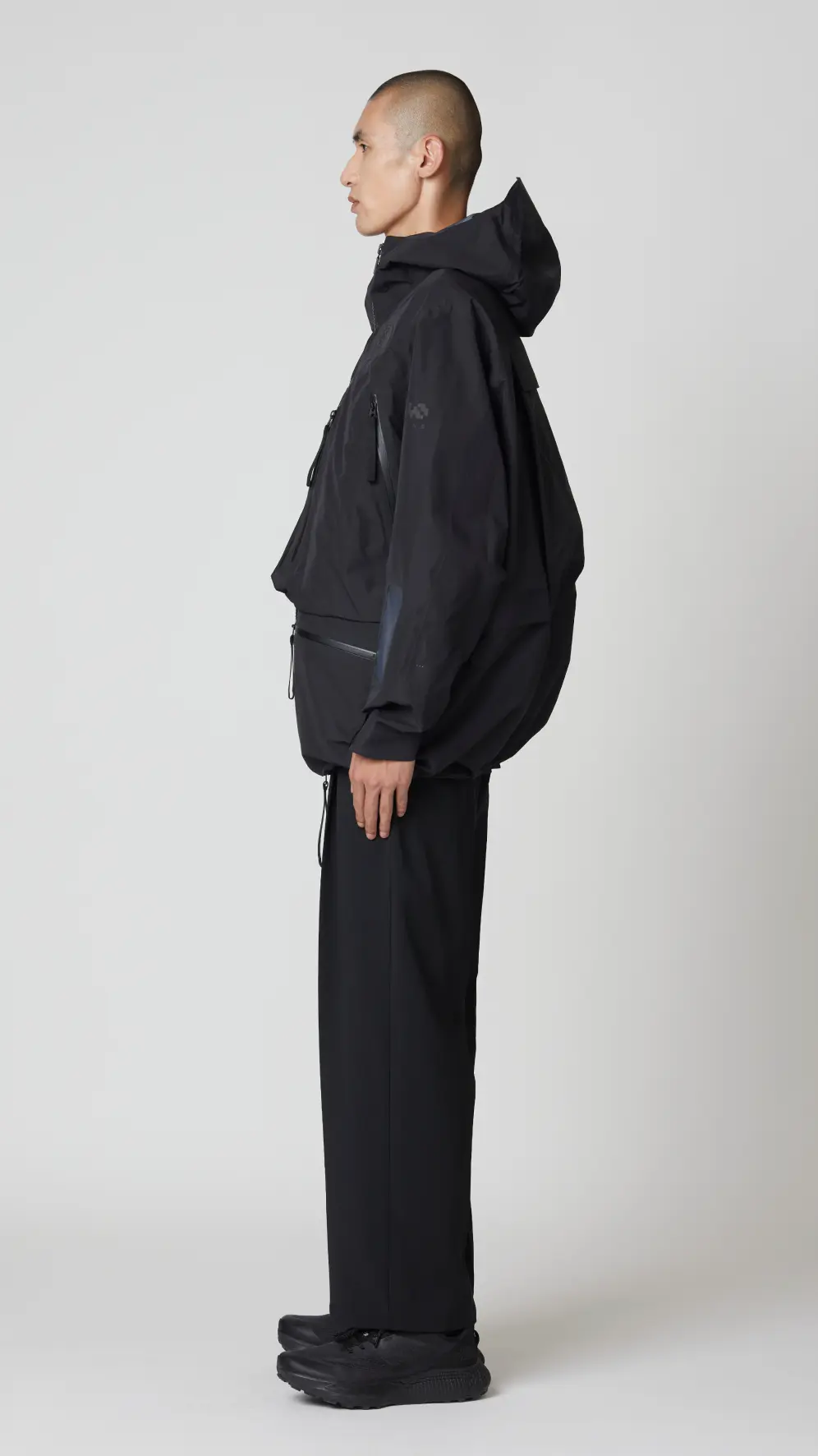専用ポンプで保温性の強弱を調整可能で収納力にも長けたベストと、スマートフォンを収納可能な大型クリアウィンドウを含めた多数のポケットを備える防水ジャケット。その二つのプロダクトは単体での着用はもちろん、レイヤリングにおいても相互的に機能するようにデザイン・設計されている。ベストはジャケットの内側に着用すれば保温性を担保するミドラーとして、ジャケットの外側に着用する際は収納力を最大限に発揮するギアベストとして機能する。ジャケットも内側に着たベストに直接アクセス可能なポケットの配置や着方の幅に対応するシルエットなど綿密に設計された。