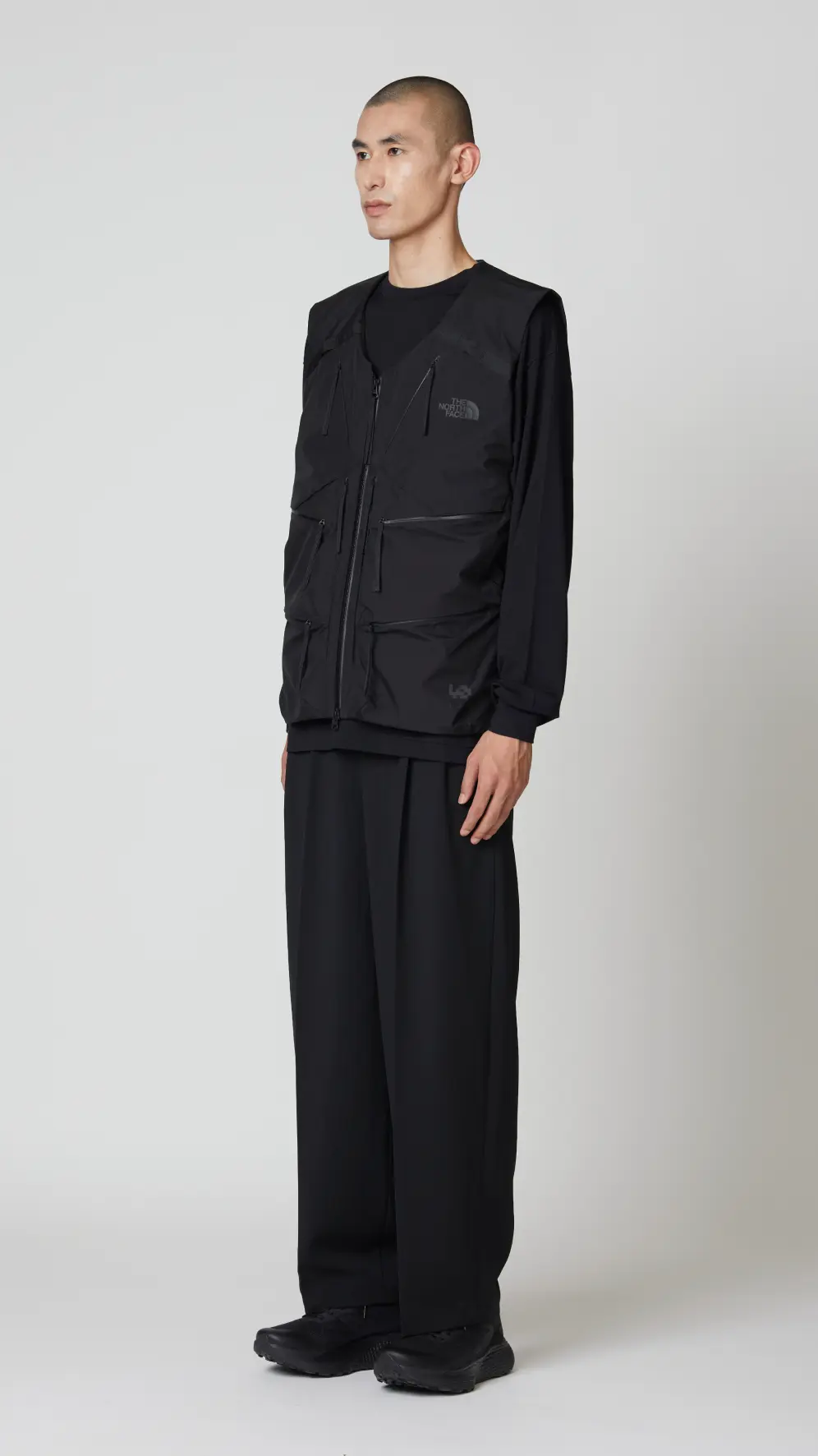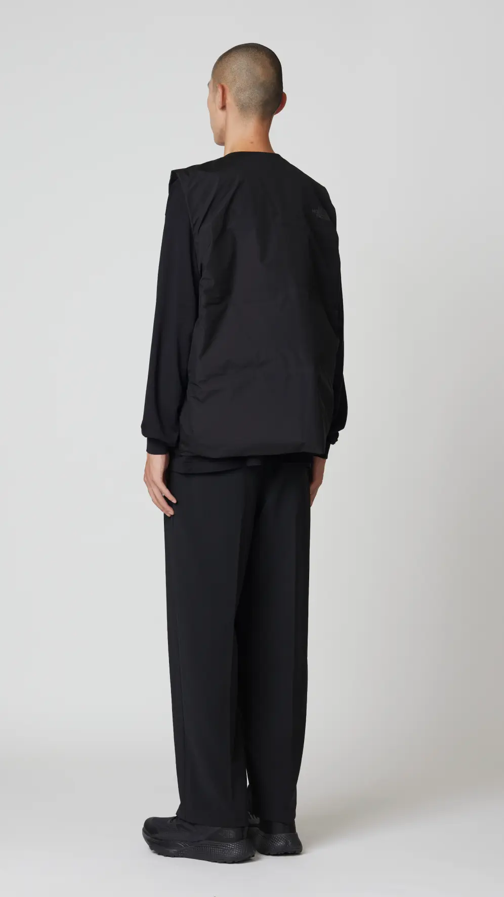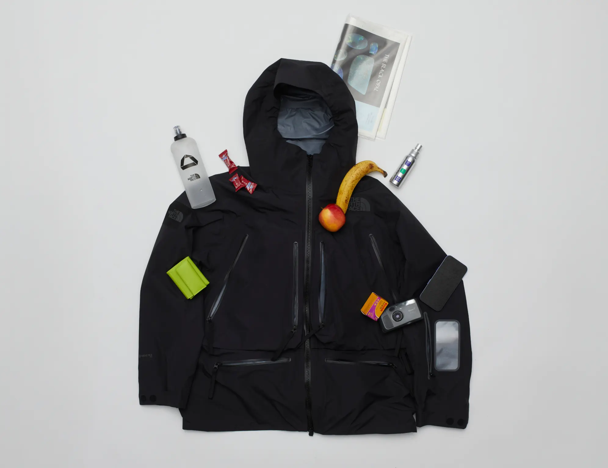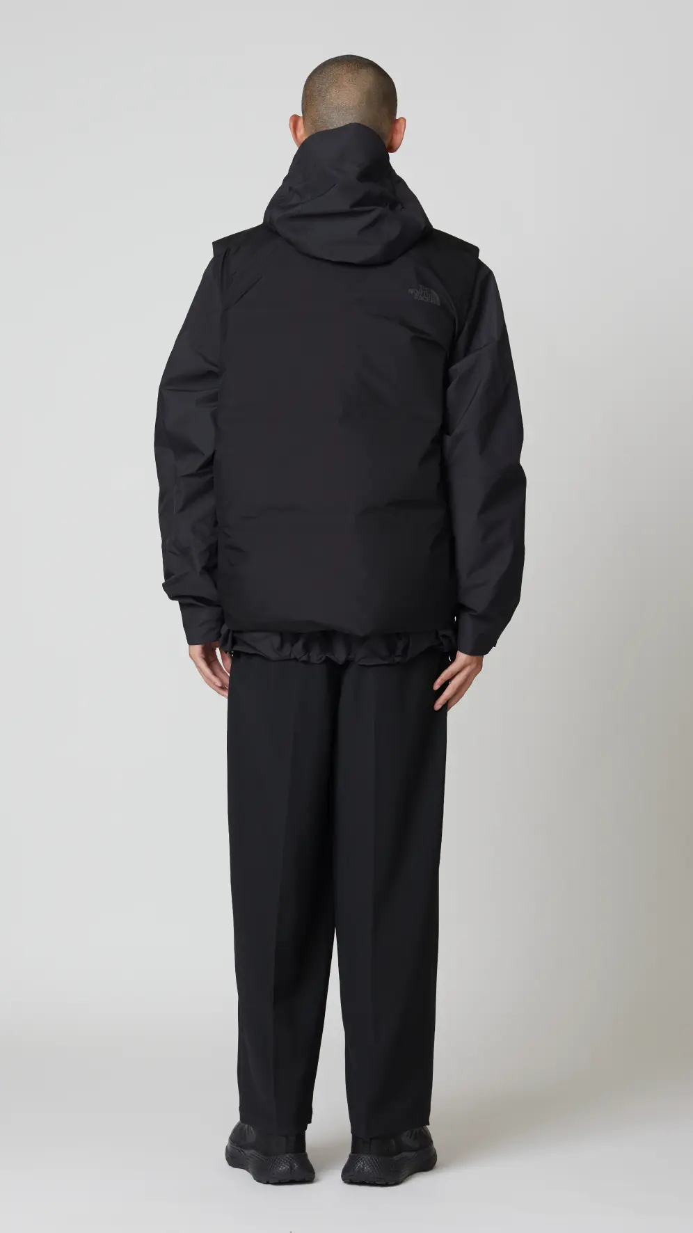 専用ポンプで保温性の強弱を調整可能で収納力にも長けたベストと、スマートフォンを収納可能な大型クリアウィンドウを含めた多数のポケットを備える防水ジャケット。その二つのプロダクトは単体での着用はもちろん、レイヤリングにおいても相互的に機能するようにデザイン・設計されている。ベストはジャケットの内側に着用すれば保温性を担保するミドラーとして、ジャケットの外側に着用する際は収納力を最大限に発揮するギアベストとして機能する。ジャケットも内側に着たベストに直接アクセス可能なポケットの配置や着方の幅に対応するシルエットなど綿密に設計された。