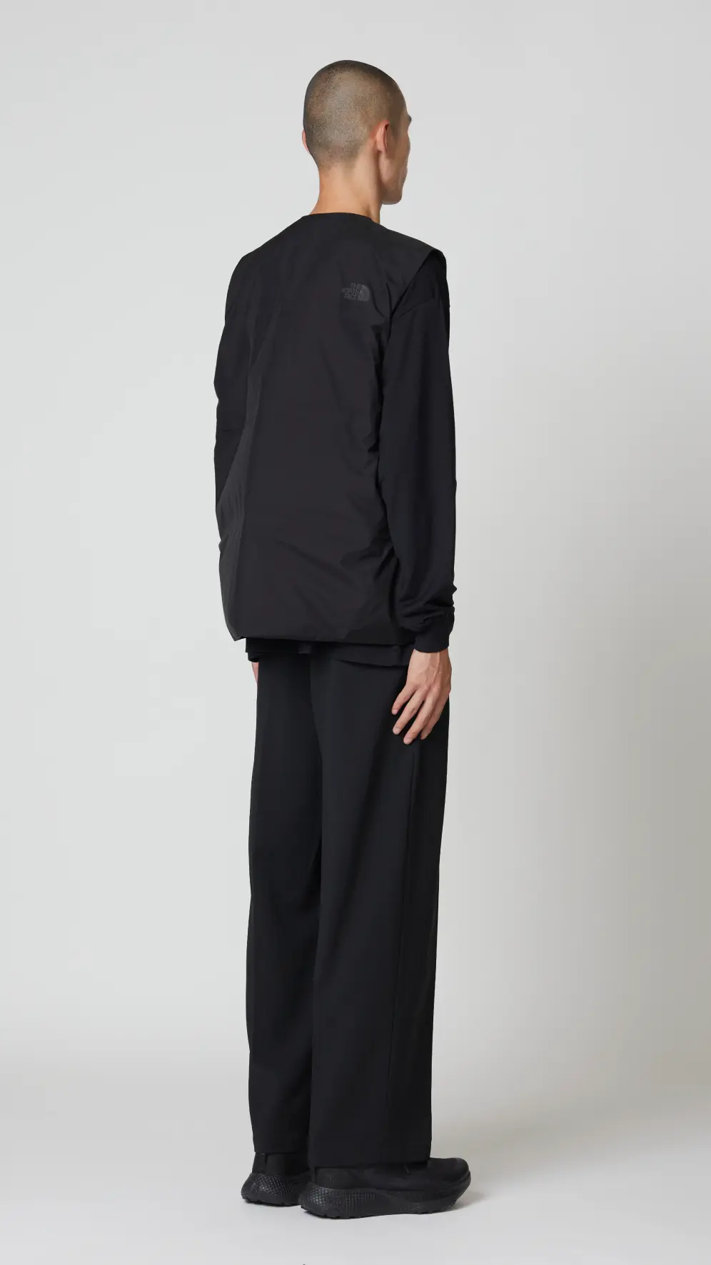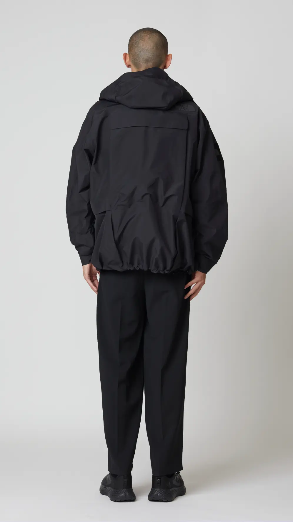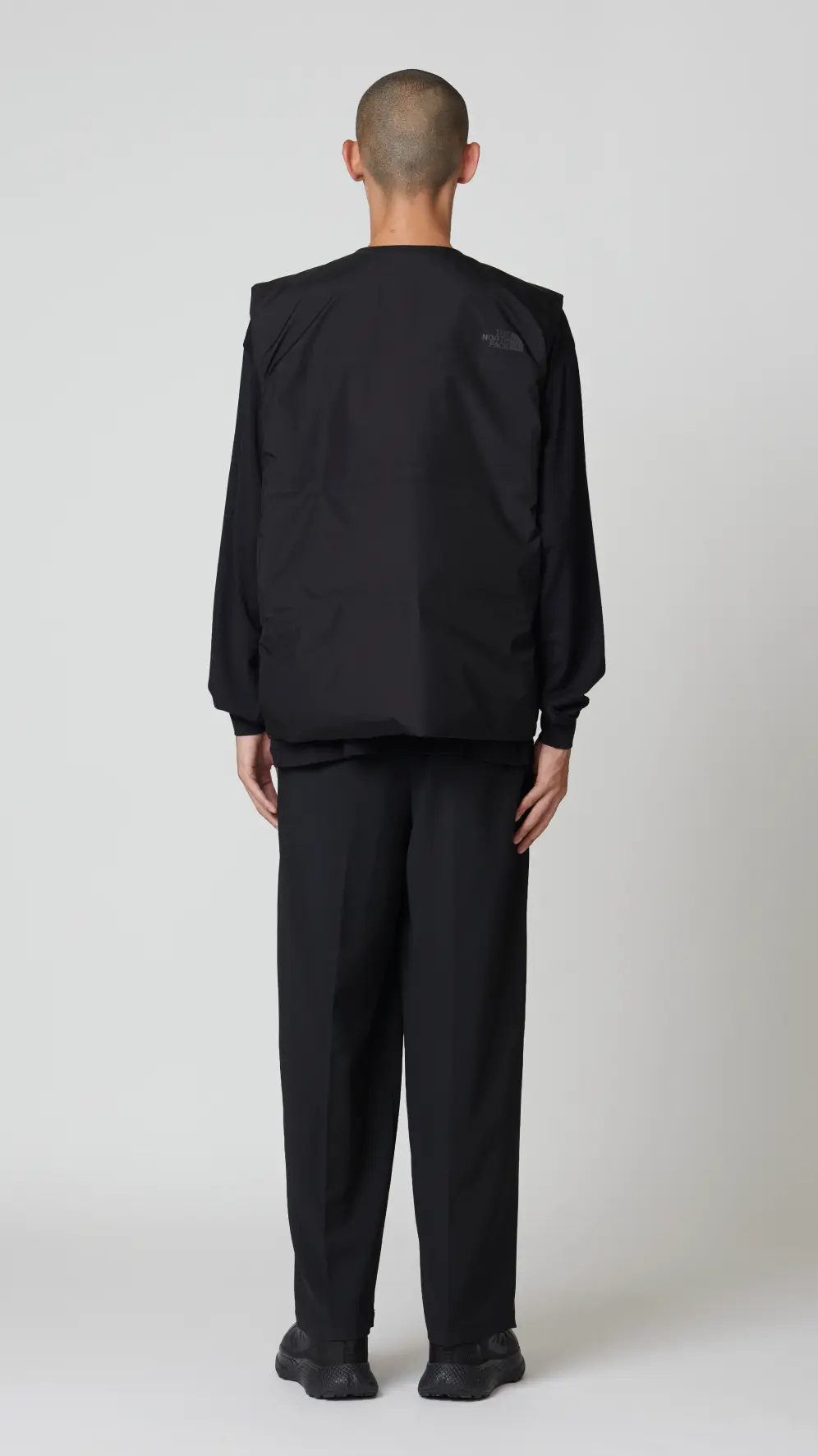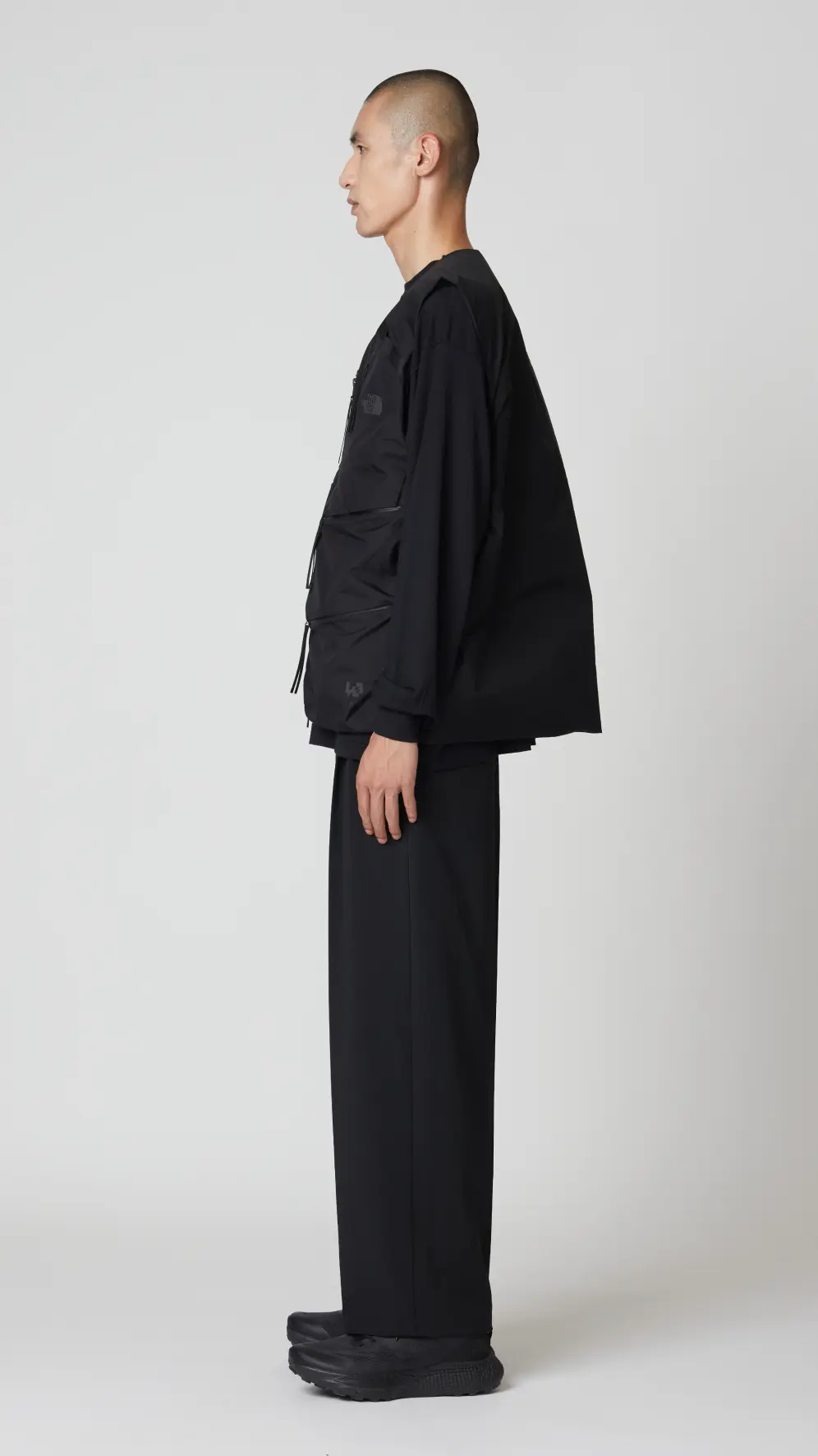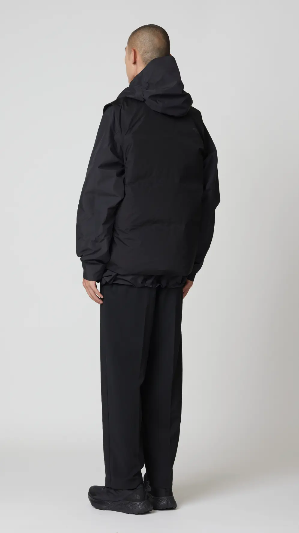 専用ポンプで保温性の強弱を調整可能で収納力にも長けたベストと、スマートフォンを収納可能な大型クリアウィンドウを含めた多数のポケットを備える防水ジャケット。その二つのプロダクトは単体での着用はもちろん、レイヤリングにおいても相互的に機能するようにデザイン・設計されている。ベストはジャケットの内側に着用すれば保温性を担保するミドラーとして、ジャケットの外側に着用する際は収納力を最大限に発揮するギアベストとして機能する。ジャケットも内側に着たベストに直接アクセス可能なポケットの配置や着方の幅に対応するシルエットなど綿密に設計された。