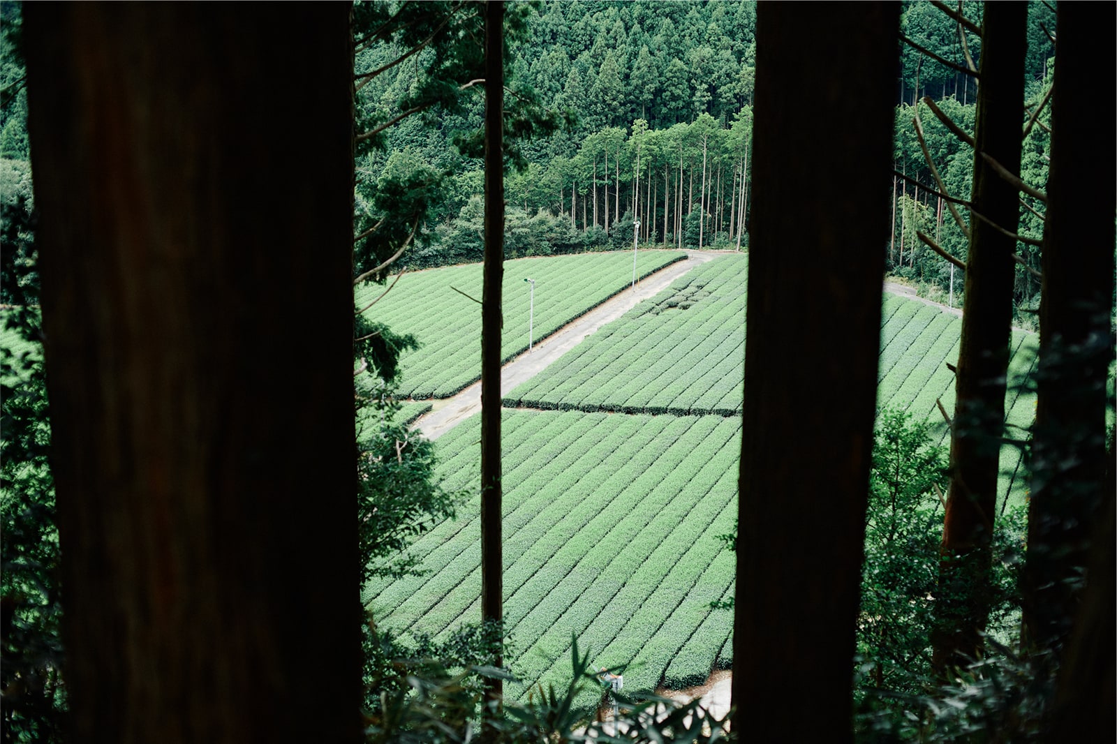 しばらく続いた山の中を抜けると、再び、広々とした茶畑の風景が待っていた。山の斜面に沿って整備された茶畑の麓には集落の姿が見えてくる。