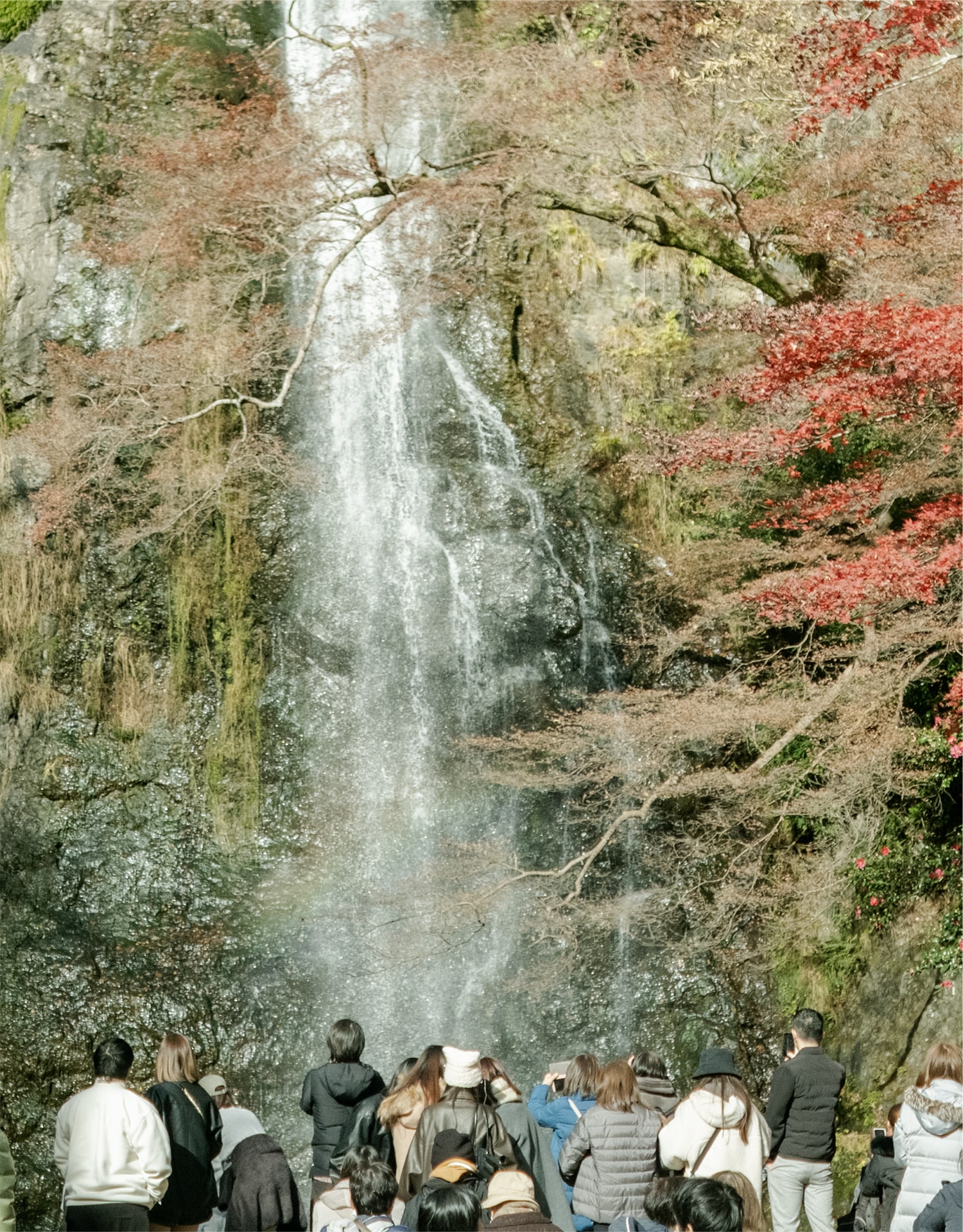 落差33m。大滝の名に相応しい壮大な姿で、日本の滝百選にも選定されている大阪を代表する名爆が箕面大滝だ。箕面大滝の流れ落ちる姿が農具の「箕」の面に似ていることから「箕面大滝」と呼ばれるようになり、箕面という地名も滝に由来していると言われている。